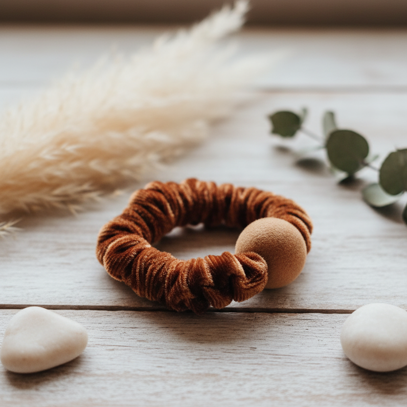Add a touch of warmth and luxury to your hairstyle with our Copper Velvet Ball Scrunchie. This beautiful hair tie features a rich, autumnal brown velvet that is ruched for texture and finished with a perfectly matched decorative velvet sphere. It's the ideal accessory for a subtle pop of color and sophisticated style.