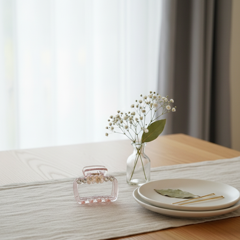 Add a sweet and romantic touch to your style with our Romantic Rose Crystal Bloom Clip. This beautiful accessory features a translucent soft blush pink acrylic body, elegantly adorned with sparkling rhinestones and charming white floral accents. It's the perfect clip for achieving a delicate, polished, or whimsical look.