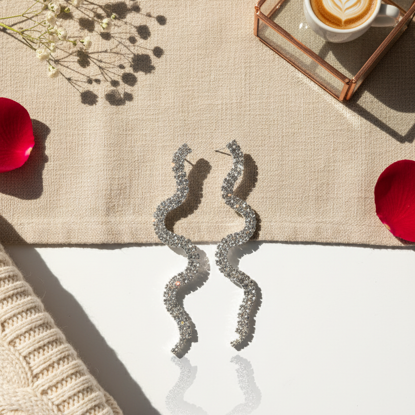 Architectural and chic. These modern earrings feature a small, fixed stud that connects to a horizontal bar or accent piece, from which a longer line or chain drops. This asymmetrical design is trendy, professional, and ideal for customers seeking a contemporary, high-fashion look that moves with them